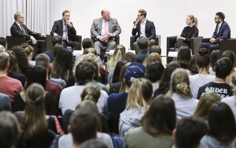 Nach seiner Ansprache stellte sich Botschafter McMullen einem Panel von Tourismusstudierenden und Mitgliedern der Fakultät. Es diskutierten die Studierenden Jennifer Keller, Jamie Rizzi und Aljoscha Keller sowie Dozent Michael Kauer und Studienleiter Dr. Merkle mit Botschafter McMullen.