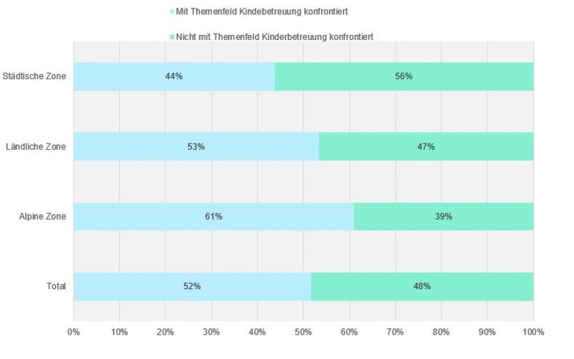 Die halbjährlich von HotellerieSuisse durchgeführte Umfrage zur Lageeinschätzung zeigt: Für über die Hälfte der Betriebe (52 Prozent) ist die Kinderbetreuung der Mitarbeitenden ein Thema. In städtischen Zonen fällt der Anteil mit 44 Prozent geringer aus als in alpinen Zonen (61 Prozent). Das vergleichsweise grössere Angebot an Kinderbetreuung rund um die Städte dürfte hierfür die Erklärung sein.