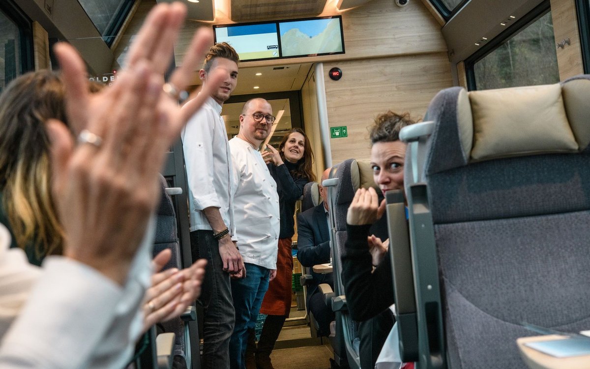 Mais le repas préparé par Stéphane Décotterd, restait un défi de taille puisque le wagon ne propose qu’une plaque à induction qui le situe bien loin des fastes de l’Orient-Express où officie désormais le chef français Jean Imbert. Pour Stéphane Décotterd, il fallait aussi gérer les mouvements du wagon et des passagers, malgré tout le luxe de cette nouvelle classe prestige. Il s’agissait d’une vraie proposition gastronomique avec bouchées apéritives, deux entrées, un plat et un dessert.