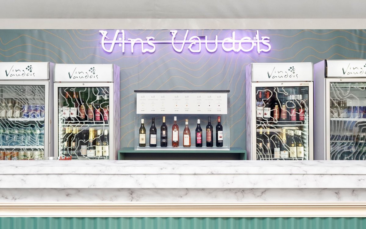 Une décoration thématique a été spécialement imaginée pour donner un caractère inoubliable à l’endroit. Le vert et le blanc, bien vaudois, sont naturellement à l’honneur, dans une version stylisée et rehaussée de traits d’or figurant la topographie de nos vignobles. Un grand bar et des tables hautes accueillent les hôtes et leurs verres de vin vaudois.