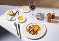 In der First Class erwartet die Gäste Gerichte wie Hummerschwanz und Bisque-Mousse, Stangensellerie und Radieschen mit Yuzu-Estragon-Vanillevinaigrette, Petersfischfilet mit Räucherstör-Beurre blanc, Kichererbsen-Panisse und Broccolini und Reh-Entrecôte mit Herbsttrompetencrème, Pfeffersauce