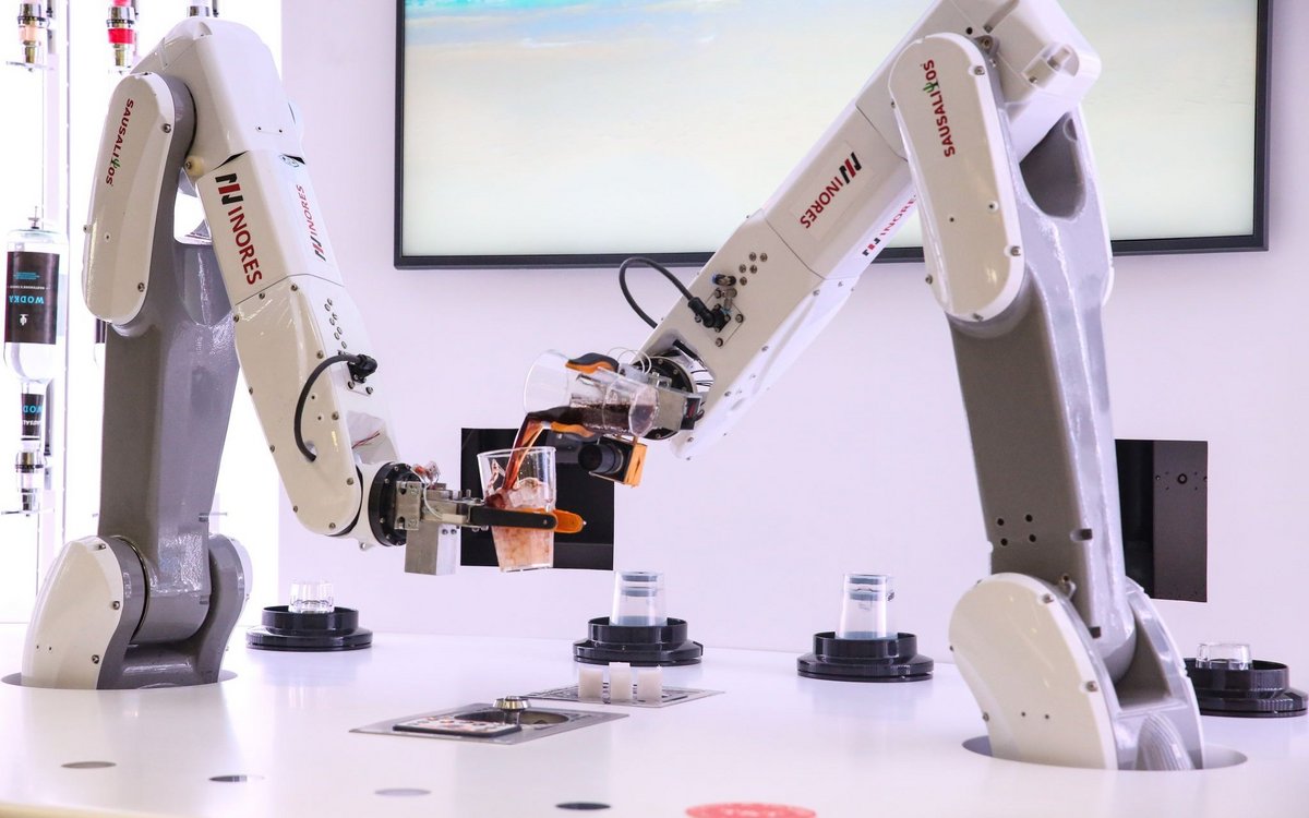 An der Robotbar im Flagshipstore von Deutschlands grösster Cocktail-Kette läuft vieles digital: Über eine eigene App wird das Getränk bestellt und auch gleich bezahlt, der Roboter setzt seine beiden programmierten Arme in Aktion. Der mechanische Barkeeper wird dabei nicht unter dem Tresen oder in der Küche versteckt, sondern verrichtet seine Arbeit als Show-Element vor den Augen des Gastes. Anschliessend muss die Bedienung den Drink nur noch servieren.