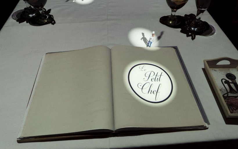 Das Konzept funktioniert so: Der kleine Chefkoch reist um die Welt (und klettert manchmal in den Teller). Der Gast reist visuell mit, denn das Ganze wird in Miniaturformat über eine 3D-Projektion direkt auf den Tisch übertragen. Passend zu den sechs Stationen seiner Reise gibt es jeweils einen Gang des Menüs.