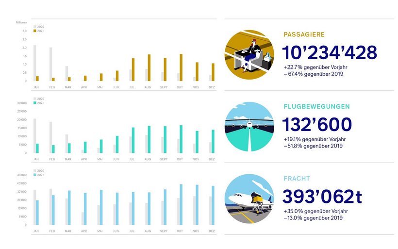 Im ersten Halbjahr 2021 habe der Flughafen tiefe Passagierzahlen erlebt, die von einer Erholung im Sommer und Herbst gefolgt wurden. Mehrfach ändernde Reise- und Quarantänebestimmungen und eine erneut unsicheren Situation Ende Jahr hätten sich im Jahr 2021 auf das Passagier- und Verkehrsvolumen am Flughafen Zürich ausgewirkt.