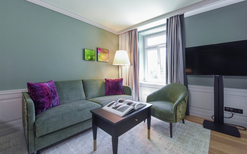 Mit dem Umbau lebt der alte Glanz des «Cresta Palace» neu auf. So spiegelt das neue Interior- und Farbkonzept Elemente des Jugendstils wider, spielt mit Stofflichkeit, überzeugt mit Details und Materialien. Bei der Auswahl der Möbel und Betten setzte man auf Manufakturen und entwarf eigens Möbelstücke.