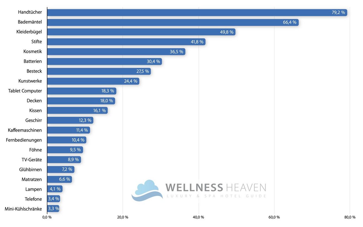 Das Mitnehmen von Seifen oder Stiften gilt vielen Hotelgästen als Kavaliersdelikt, doch dabei bleibt es bei Weitem nicht: Manche Besucher sind so dreist, dass sie Fernseher, Matratzen, Klaviere oder gar ausgestopfte Tiere aus dem Hotel tragen. Wellness Heaven hat dieses Jahr 1'376 Hoteliers befragt, welche Gegenstände am häufigsten entwendet werden. Besonders pikant ist das unterschiedliche Klauverhalten zwischen Gästen in 4-Sterne und 5-Sterne Hotels. (mm)
