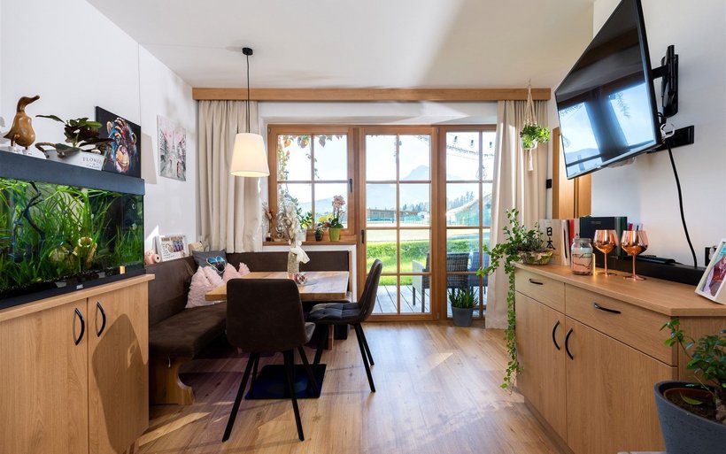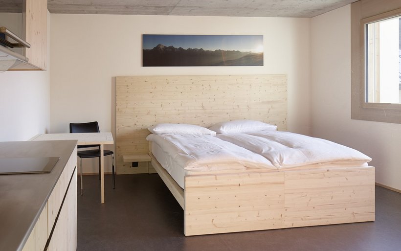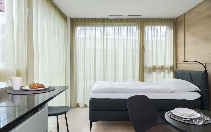 Besonderes: Unterkunft entspricht 4-Stern-Superior-Hotelkategorie: hochwertig ausgestattet mit eigener Küche, begehbarem Kleiderschrank, heimeliger Holzdecke, modernem Bad mit Regendusche, grosszügigem Boxspring-Bett, Flatscreen-TV und W-LAN, Balkon oder Garten. In der Residenz hat es ein top ausgestattetes Fitness-Studio inklusive Panoramaverglasung. Den Mitarbeitenden steht ferner ein Seminarraum für Weiterbildungen, Yoga, Meditation und Feierlichkeiten zur Verfügung. Die Waschküche ist mit einer App steuerbar und in der Tiefgarage für Autos und Fahrräder hat es E-Ladestationen. Direkt nebenan ist ein Sportplatz.