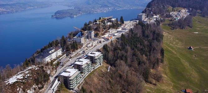 In den nächsten Tagen und Wochen sollen die Bauarbeiten für das neue BürgenstockResort an Intensität zunehmen. Gegen 500 Planer und Bauarbeiter werden im Einsatzstehen. Wurde in den vergangenen Jahren viel Zeit und Geld in den Tiefbau und dieBasisinfrastruktur investiert, so werden ab sofort die Baufortschritte deutlich sicht- underlebbar.Das am Dienstag mit Kameradrohne aufgenommene Foto zeigt: Das neue Bürgenstock Resort nimmt Gestalt an.