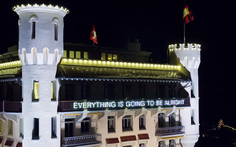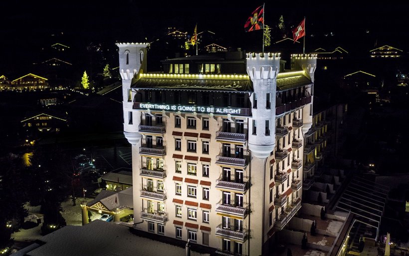 Freunden, Passanten und den Bewohnern Gstaads, die in der Hotellobby – besser bekannt als «Stube Gstaads» – in diesem Winter nicht einkehren können, gibt das 5-Sterne-Superior-Haus in Form leuchtender Buchstaben Zuversicht mit auf den Weg. Während der gesamten Wintersaison illuminiert die Neon-Installation «Work No. 3485 Everything is going to be alright» des britischen Künstlers Martin Creed die Fassade des «Palace». Die Berner Oberländer Luxusherberge stellt seit 2019 in Zusammenarbeit mit der Kunstgalerie Hauser & Wirth Kunstwerke aus.