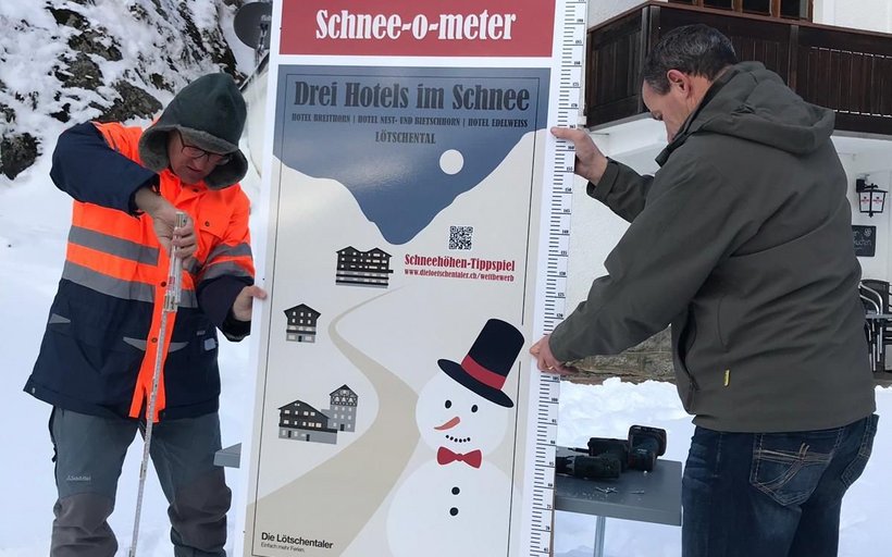 Was im letzten Winter mit der augenzwinkernden Anlehnung an den Filmklassiker «Drei Männer im Schnee» und dem Schneemann-Wettbewerb der «Drei Hotels im Schnee» begann, findet jetzt eine Fortsetzung: Die Hotelkooperation «Die Lötschentaler» mit den Hotels Breithorn, Edelweiss sowie Nest- und Bietschhorn lädt zum Schneehöhen-Tippspiel ein. Beim Hotel Breithorn am Dorfeingang von Blatten auf 1'540 m ü. M. steht die Tafel der «Drei Hotels im Schnee» mit integriertem «Schnee-o-meter». Ab Boden bis zur Plakatspitze sind es 200 cm.