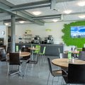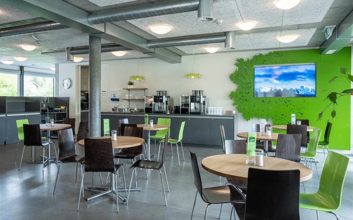 Ruheoasen, Gesprächsecken, Esstische und eine TV-Lounge stehen den Gästen im Erdgeschoss zur Verfügung. Im Obergeschoss warten ein grosser Holztisch, diverse Arbeits- und Ruhezonen sowie eine gemütliche Kamin-Installation mit dazugehörender Holzbeige auf die Gäste. Die satten Grün- und erdigen Brauntöne wirken entspannend und zugleich erfrischend und die renovierten Räumlichkeiten laden so zum konzentrierten Arbeiten und entspannten Verweilen ein.