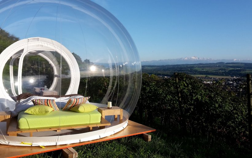 Ab dem 1. April sind Buchungen für eine Nacht im durchsichtigen Kugelzelt auf dem Weingut Burkhart möglich. Gleich zwei Himmelbetten stehen an den Rebhängen des Ottenbergs und bieten einen Ausblick über Weinfelden bis zum Alpstein. Schon im Jahr 2017 wurde auf dem Weingut Burkhart für die Herbstsaison ein Himmelbett aufgestellt. Der Betreiber Michael Burkhart sei vertraut mit dem Projekt und freue sich auf viele Gäste auf seinem Weingut, schreibt Thurgau Tourismus in einer Mitteilung. Eine Nacht im Bubble-Hotel gibt es ab 220 Franken. (htr)