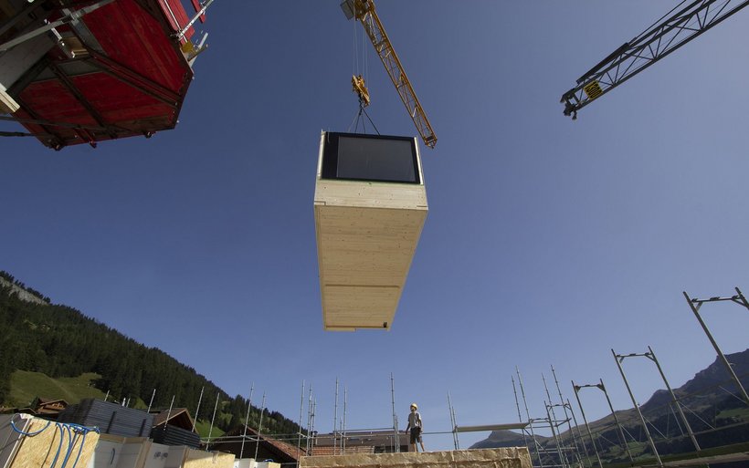 Im Hotelbau ist diese innovative Bauweise bisher noch wenig verbreitet. Mit dem Hotelkonzept setzt die Bauherrin, die Fortimo AG aus St. Gallen, neue Massstäbe und realisiert in Adelboden das zweite Modulhotel nach der Revier Mountain Lodge in der Lenzerheide. Die Zimmereinheiten wurden in lokalen Holzbauunternehmen produziert.