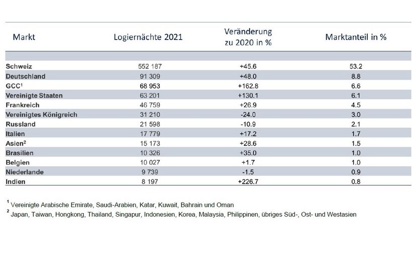 [IMG 2]Neben dem Heimmarkt haben sich nach dem pandemiebedingten Einbruch 2020 verschiedene Märkte wieder erholt. Die Entwicklungen der ausländischen Herkunftsländer fallen jedoch sehr heterogen aus. So konnten benachbarte europäische Märkte wie Deutschland (+48,0%) oder Frankreich (+26,9%) ebenfalls wieder deutlich zulegen. Mit einem Wachstum von 162,8 Prozent gegenüber 2020 schieben sich die Golfregionen wieder den dritten Platz der grössten Herkunftsländer.