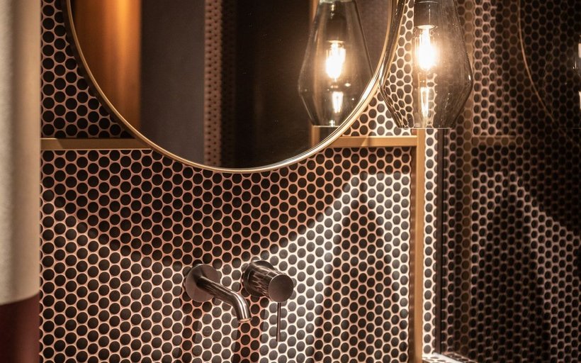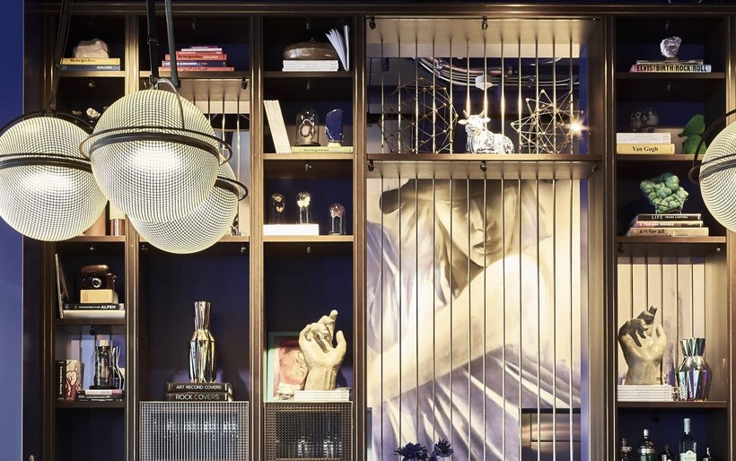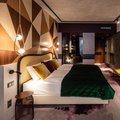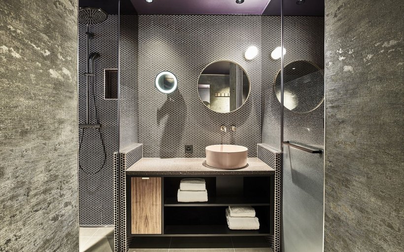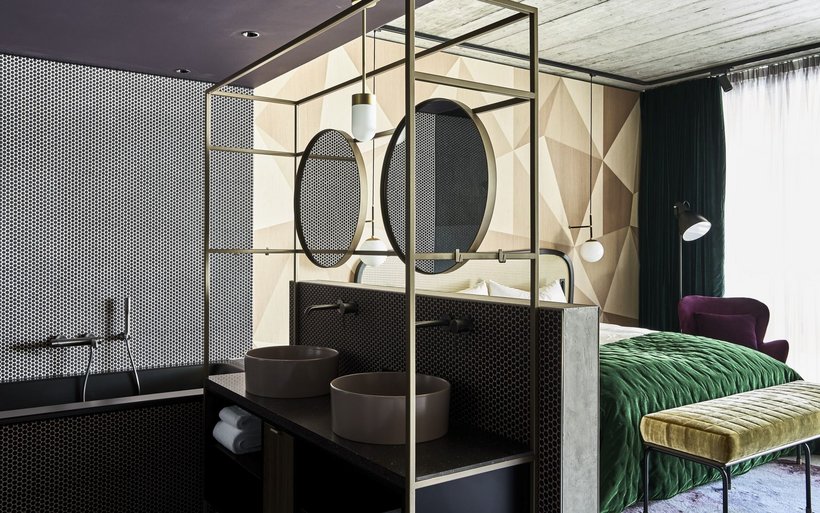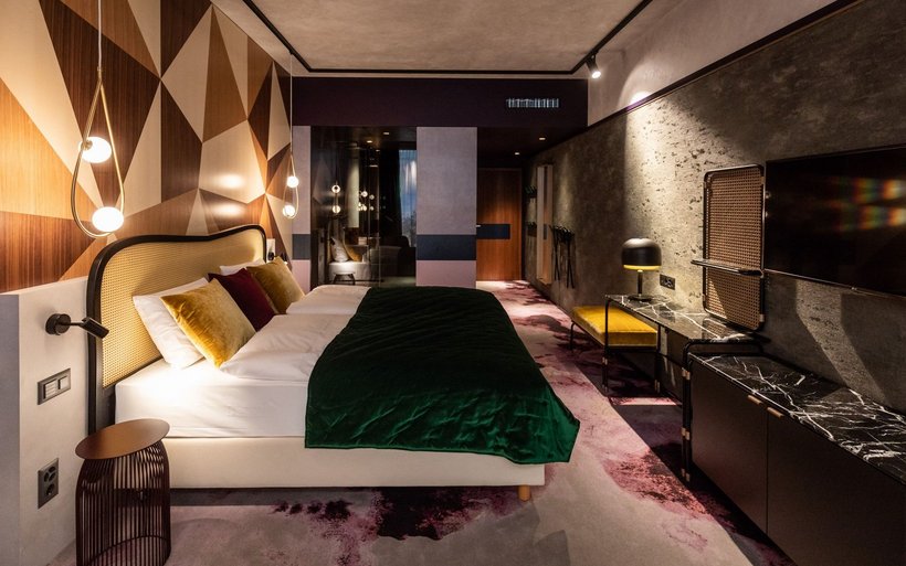 Die 47 Gästezimmer und Suiten im obersten Stockwerk habe Erik Nissen Johansen von Stylt Trampoli eindrucksvoll in Szene gesetzt, schreibt Design Hotels weiter. Oszillierende Tapeten und juwelenfarbene Samtstoffe harmonieren mit geometrischen Wandverkleidungen und raumhohen schwarzen Mosaikfliesen. Akzente aus Messing und geschickt hängende Beleuchtungen runden das Ambiente ab.
