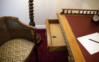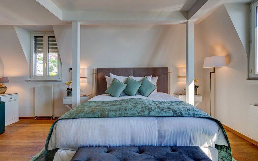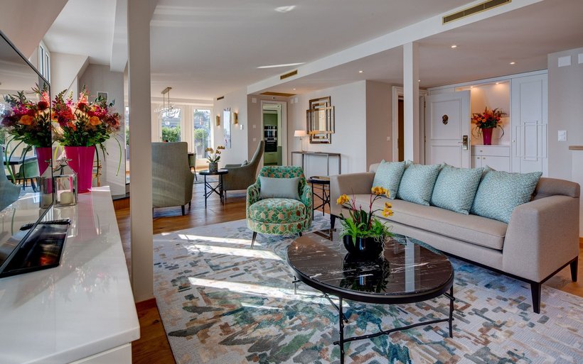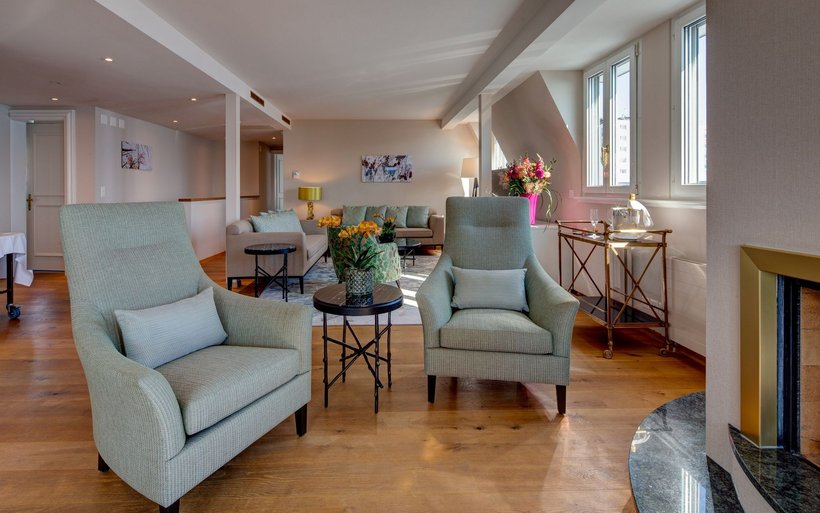 Dessinée par les architectes d’intérieur Kathrin Matthiesen et Mélanie Bach du bureau CM Design basé à Hambourg, le style créé pour la Penthouse Suite s’inspire d’une ancienne carte postale du bâtiment historique. Parmi les matériaux utilisés, le bois et les pierres naturelles occupent une place importante, notamment pour la salle de bain, la cuisine et la cheminée. Les tons blancs, crèmes et gris créent une harmonie avec le parquet de bois. Des nuances de verts qui rappellent le Léman sont sublimées par des motifs floraux apportant une touche de fraîcheur qui se retrouve également sur la terrasse fleurie. Les travaux de rénovation ont été exécutés par le bureau Felix Graf GmbH, basé à Zenting en Allemagne.