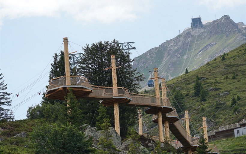 Der Bau des Abenteuerwegs begann in den von Einschränkungen geprägten Coronazeiten. Dies mag für einige etwas mutig klingen, jedoch konnte dies durch die Koordination des Inszenierungsspezialisten «Erlebnisplan» und der fachkundingen Bauleitung der Baufirmen ohne Probleme durchgeführt werden. Die Baumstämme für die Träger wurden übrigens alle aus dem Tal Schanfigg bezogen.