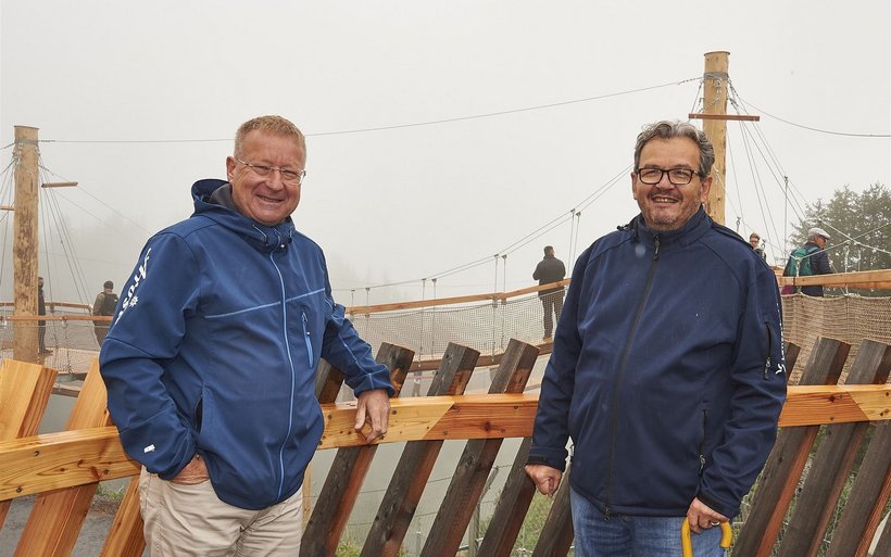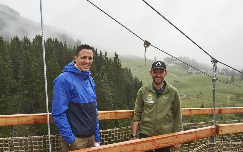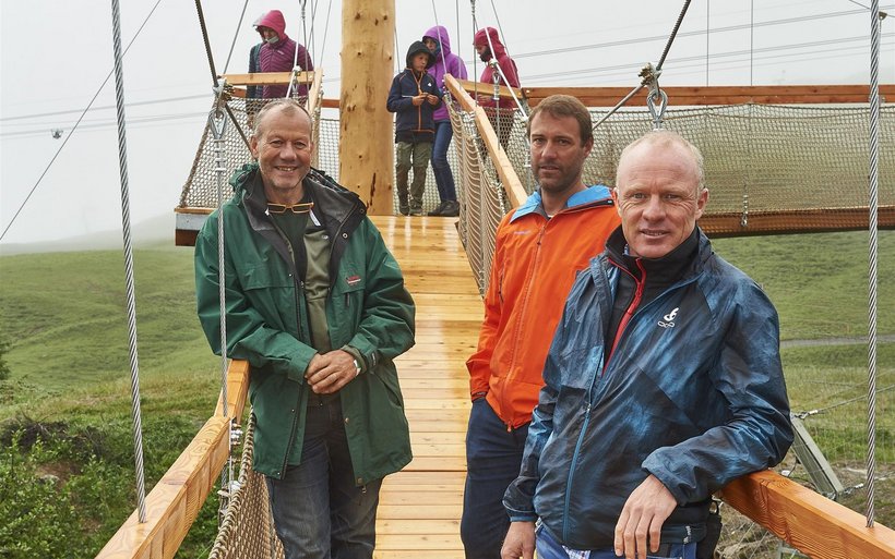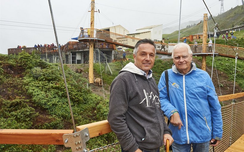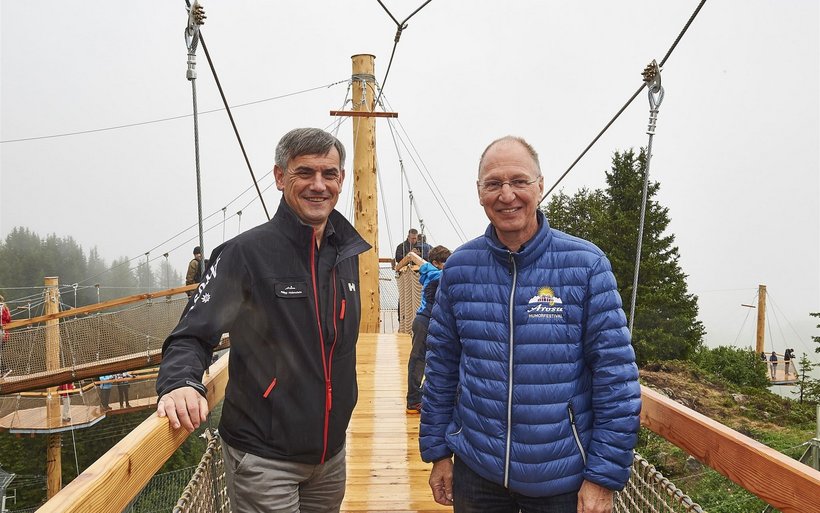 Im Anschluss betraten die ersten Gäste die Hängebrücke und konnten die drei Bären auf Augenhöhe beobachten. Der «schwebende» Abenteurweg führt direkt von der Besucherplattform aus in luftiger Höhe in Richtung des felsigen Teils der Arosa Bärenland Anlage. Die Gäste sehen dort die Bären aus grosser Distanz und einer neuen Perspektive im Waldteil der Nordanlage. Dort erhalten sie einen erlebnisreichen Einblick in die steinigen Passagen der Aussenanlage Süd. Der 80 Meter lange Weg, der zu 100 Prozent durch zweckgebundene Spenden und die Stiftung Arosa Bären finzanziert wurde, bringt sehr viele positive Punkte mit sich. Er ermöglicht den Besuchern weitere Einblicke in die Steinlandschaft und eine Weitsicht ins obere Schanfigg, wobei der höchste Punkt sechs Meter über dem Boden liegt.