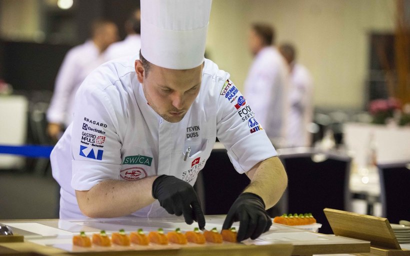 Beim ersten Wettkampf der Kochweltmeisterschaft in Luxemburg hat das Junioren-Team der Schweiz am Sonntag eine aussergewöhnliche Leistung hingelegt: Sie haben in der Kategorie Kalte Küche eine Punktzahl zwischen 90 und 100 erreicht, was Gold bedeutet. Für 80 bis 89 Punkte gibt es Silber und für 70 bis 79 Punkte Bronze. Welche Punktzahl die Schweizer Junioren-Nationalmannschaft genau erreicht hat, erfahren sie erst bei der Siegerehrung am Donnerstag. Für die Junioren geht es am Dienstag weiter mit dem Wettkampf der warmen Küche.
