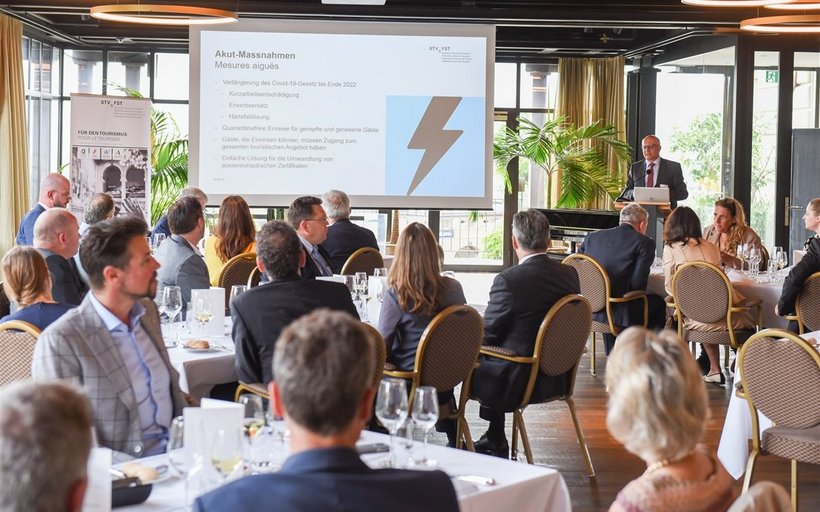 STV-Präsident Nicolo Paganini, eröffnete den Anlass und kam schnell auf die momentan grossen – natürlich Covid geschuldeten – Schwierigkeiten im Tourismus Schweiz zu sprechen: die schweizweit fehlenden Logiernächte (im Vergleich zu 2019 rund ein Drittel weniger), das Ungleichgewicht an Buchungen zwischen oft wenig besuchten Städten und hoch frequentierten Berg-Ausflugszielen, sowie das Zertifikats-Problem für amerikanische und asiatische Touristen – diese besitzen keinen «grünen» Pass und dürfen deshalb in der Schweiz vorläufig keine öffentlichen Einrichtungen oder Gastrobetriebe besuchen.