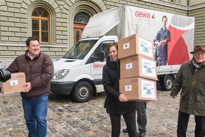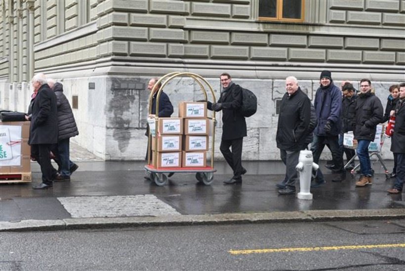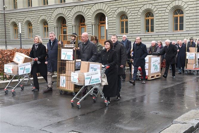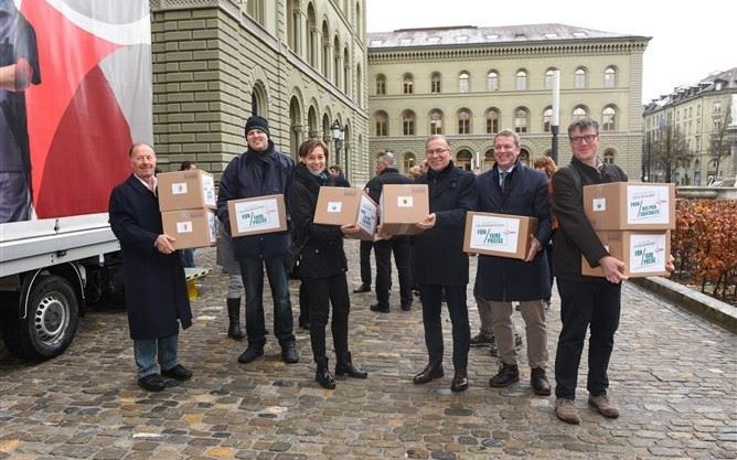 Bei garstigen äusseren Witterungen zogen die Initianten, darunter auch Vertreter aus der Schweizer Hotellerie, angeführt von hotelleriesuisse-Präsident Andreas Züllig, heute Nachmittag Richtung Bundeshaus. Auf Karren führten sie die Boxen mit den beglaubigten Unterschriften mit, die sie bei der Bundeskanzlei einreichten.