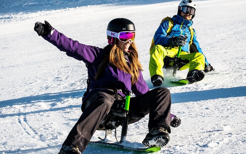 Doch zuerst absolvieren die Gäste eine Trainingseinheit im Rutschpark Trübsee. Dort können sie sich mit der Schlittenfunktion des Snooc genannten Gefährts vertraut machen. Dann startet die eineinhalbstündige geführte Tour mit Fellen an den Skiern zum Bitzistock.