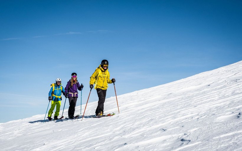 Die Schlittentour zum Bitzistock ist eine geführte Skitour und Schlittelspass in einem. Hoch geht es dabei auf zwei kleinen Skiern, die oben auf dem Berg zu einem einkufigen Schlitten umgebaut werden.