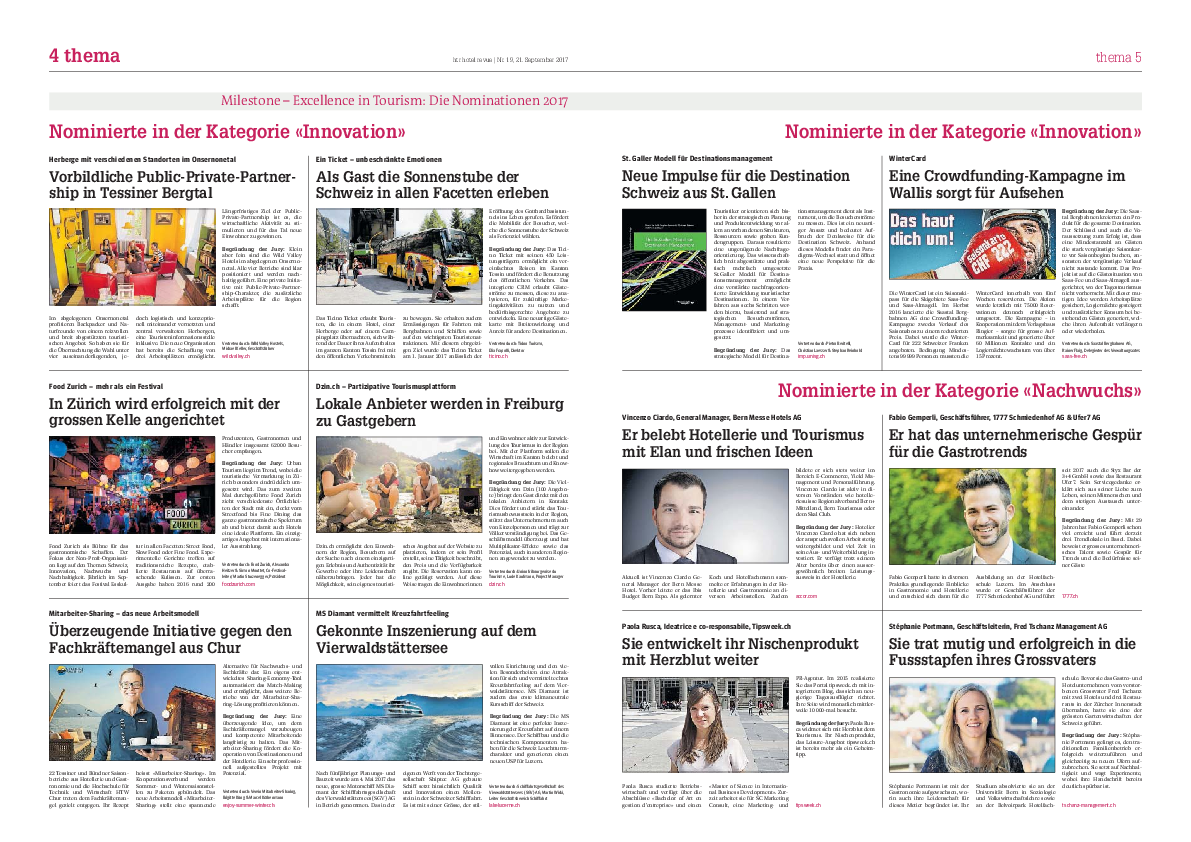 Stark vertreten mit drei Kandidaturen ist für einmal das Tessin, während sich beim «Nachwuchs» gleich vier innovative Hoteliers und Touristiker Hoffnung auf den Sieg machen dürfen. Verzichtet haben die Juroren unter dem Vorsitz von Ruth Metzler-Arnold dagegen auf Nominationen in der Kategorie «Nachhaltigkeit».