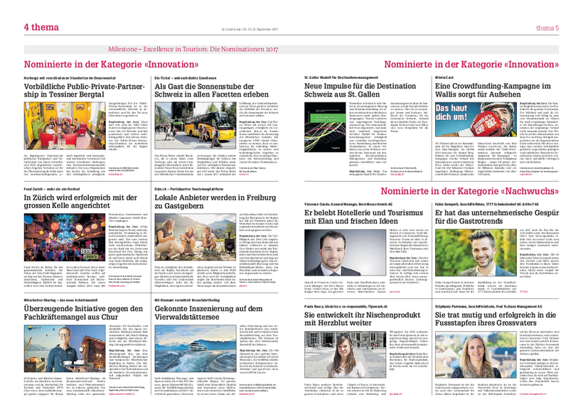 Die Branche freut sich diese Woche über den nationalrätlichen Entscheid für unternehmerische Freiheit - und zeigt sich dabei von ihrer attraktivsten Seite. Denn die Nominationen für den diesjährigen Schweizer Tourismuspreis Milestone, die wir in dieser Ausgabe vorstellen, zeugen von ihrer Vitalität und unternehmerischer Power. Dass sich unter den acht für den Hauptpreis «Innovation» nominierten Bewerbern auch einige kleinere Organisationen befinden, freut mich besonders. Auch mit kleinerem Budget ist erfolgreich und nachhaltig umgesetzte Innovation machbar.