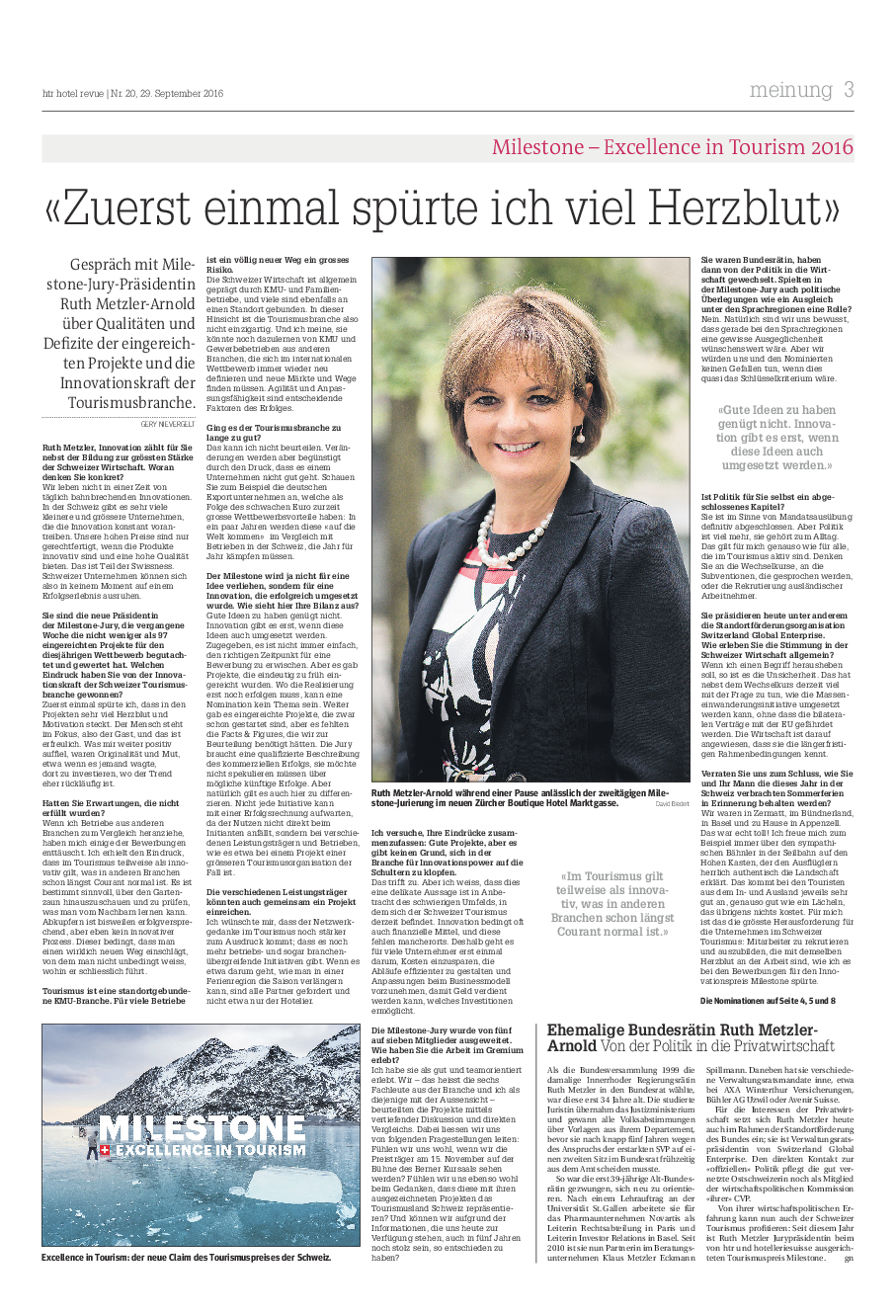 Im Gespräch mit der htr hotel revue, die zusammen mit hotelleriesuisse den Innovationspreis «Milestone Excellence in Tourism» vergibt, zieht die ehemalige Bundesrätin und heutige Beraterin in der Privatwirtschaft differenziert Bilanz. Einerseits habe sie verspürt, dass in den eingereichten Projekten viel Herzblut und Motivation stecke: «Der Mensch steht im Fokus, also der Gast, und das ist erfreulich.» Andererseits meint Ruth Metzler aber auch: «Ich erhielt den Eindruck, dass im Tourismus teilweise als innovativ gilt, was in anderen Branchen schon längst Courant normal ist.» Es sei bestimmt sinnvoll, vermehrt über den Gartenzaun zu blicken.