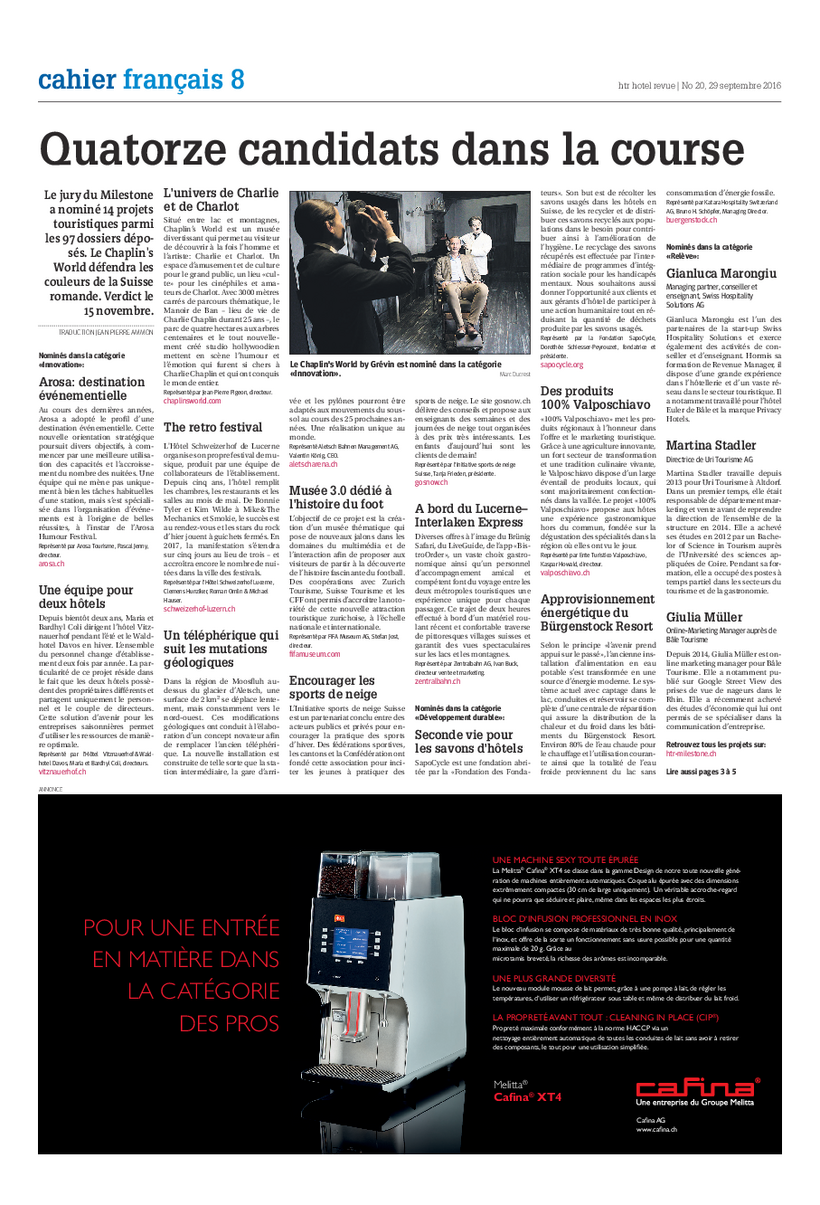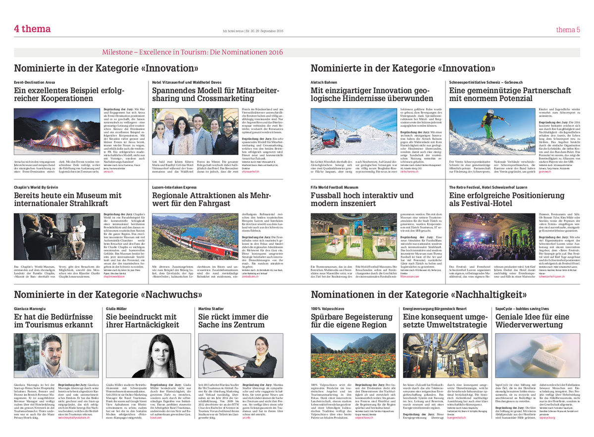 Während zweier Tage hat die siebenköpfige Milestone-Jury Mitte September im Zürcher Boutique-Hotel Marktgasse getagt und aus der Fülle von 97 eingereichten Projekten und Bewerbungen deren vierzehn nominiert – acht in der Kategorie «Innovation» sowie je drei in den Kategorien «Nachhaltigkeit» und «Nachwuchs». Wer die diesjährigen Gewinner beim renommierten Tourismuspreis der Schweiz sind, wird an der Preisverleihung vom 15. November im Berner Kursaal bekannt. Dann wird auch der Preis für das Lebenswerk vergeben.