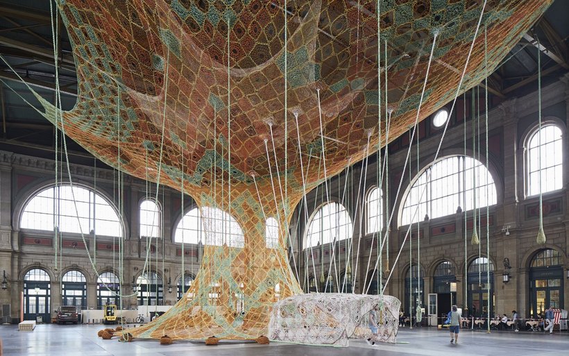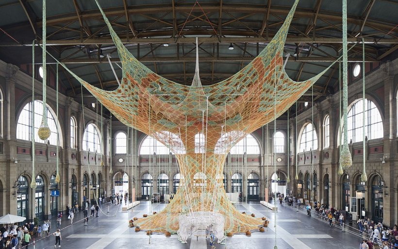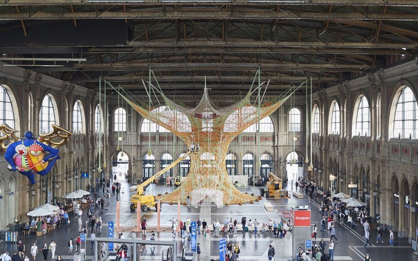 «Schuhe ausziehen, hinlegen, ein Nickerchen machen und träumen», fordert Ernesto Neto die Tausenden von Menschen auf, die jeden Tag durch die grosse Halle des Zürcher Hauptbahnhofes strömen. Der Baum solle ein Ort der Ruhe und Spiritualität sein, sagte er vor den Medien.