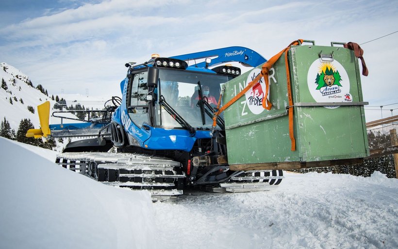 Die frische Bergluft aus ihrem neuen Zuhause konnte die Bärennase schon riechen, es folgte aber noch eine letzte Herausforderung. Nach der Ankunft im Dorf musste Jambolina in der Transportbox mit der Luftseilbahn Arosa Weisshorn in das Arosa Bärenland transportiert werden. Dort angekommen wartete ein Pistenbully, um Jambolina entgültig in ihr neues Zuhause auf über 2'000 Meter über Meer zu bringen.