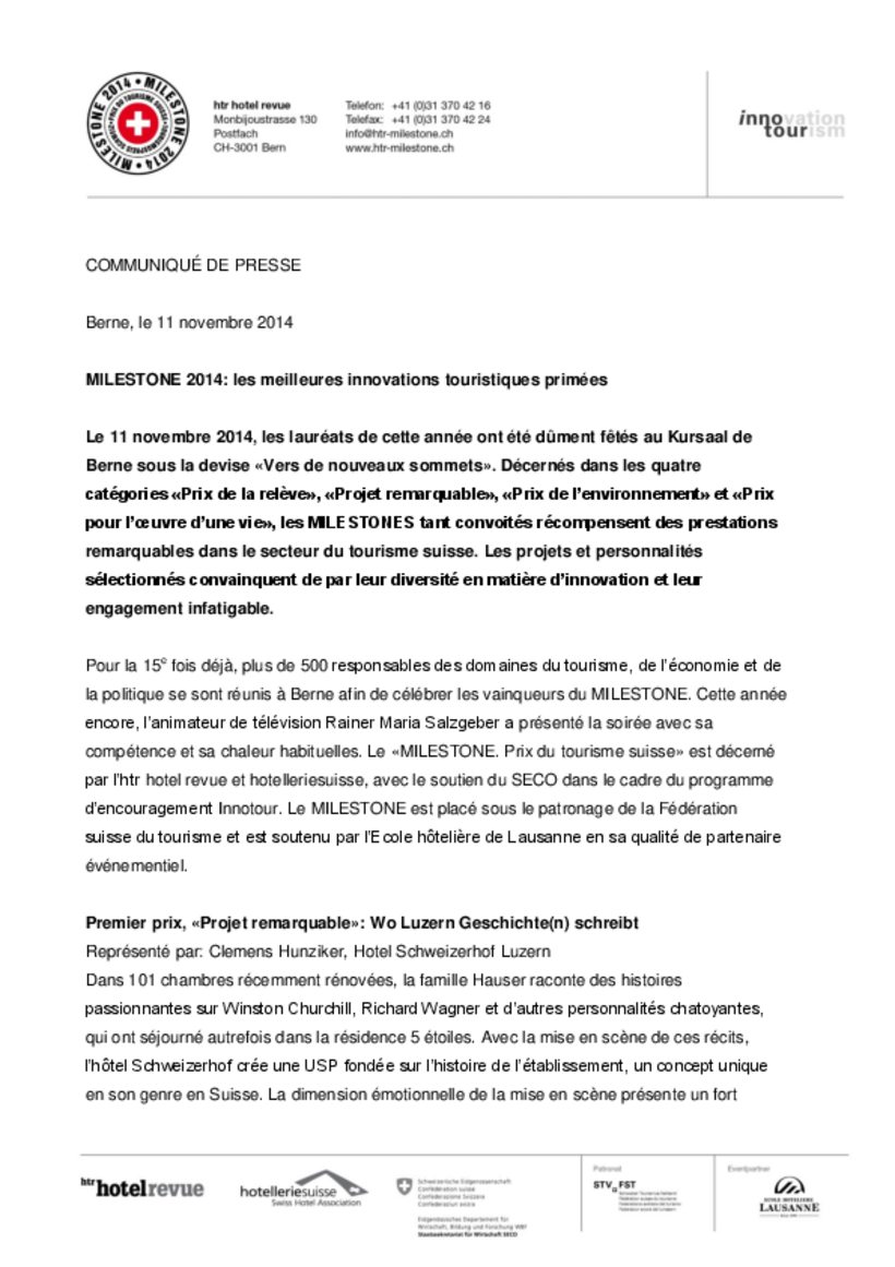 Der «Milestone Tourismuspreis Schweiz» wird seit dem Jahr 2000 von der htr hotel revue und hotelleriesuisse verliehen und vom SECO im Rahmen des Innotour-Förderprogramms unterstützt. Der «Milestone» steht unter dem Patronat des Schweizer Tourismus-Verbands. Die Ecole hôtelière de Lausanne unterstützt den Milestone als Eventpartner.