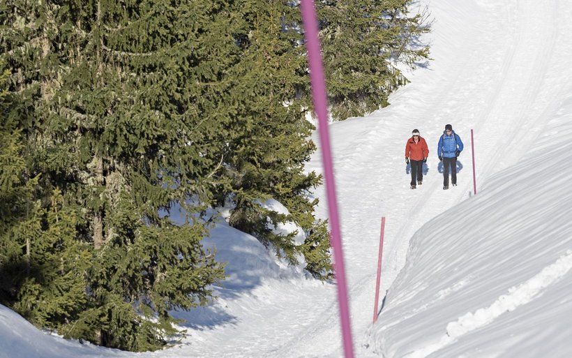 auf. Die pinke Signalisation dafür werde alljährlich extra für den Winter montiert, erklärt Daniela Rommel, die bei den Schweizer Wanderwegen für die Winterangebote verantwortlich ist.