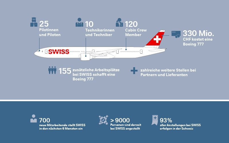 Die treibstoffeffizienteren, grösseren Flugzeuge senken laut Swiss demnach nicht nur die operationellen Kosten, sie schaffen auch neue Arbeitsplätze. «Mit der Einflottung der beiden neuen Langstreckenflugzeuge Boeing 777 im ersten Quartal 2020 werden über 300 Arbeitsplätze in der Kabine, dem Cockpit und der Technik geschaffen», hiess es.