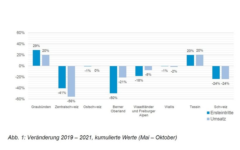 Das Tessin und der Kanton Graubünden haben dank gutem Wetter und viel Sonnenschein sowohl die Frequenzen als auch die Umsätze steigern können. Im Wallis und in der Ostschweiz konnte der schwierige Saisonstart immerhin kompensiert werden. Dort bewegt man sich Ende Saison auf einem ähnlichen Niveau wie dies im Referenzjahr 2019 der Fall war.