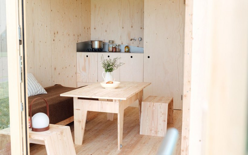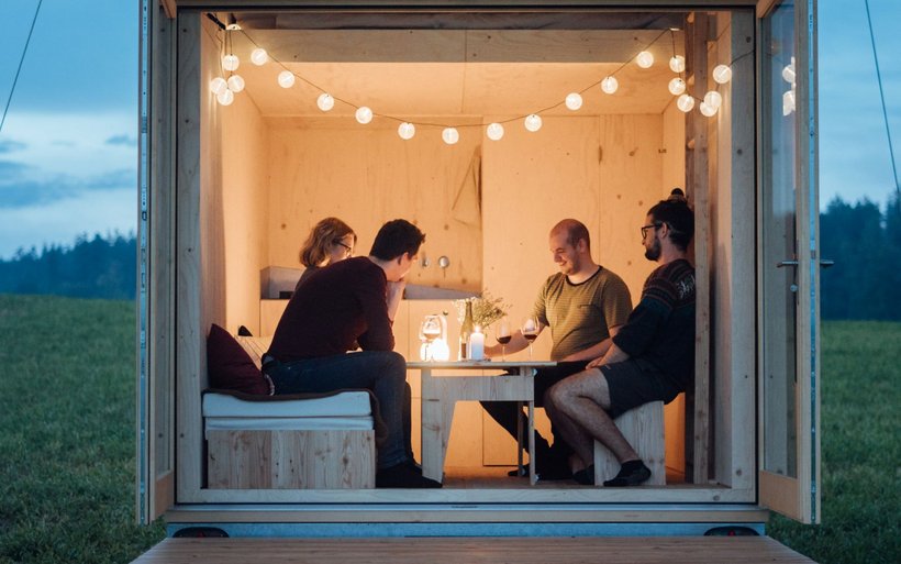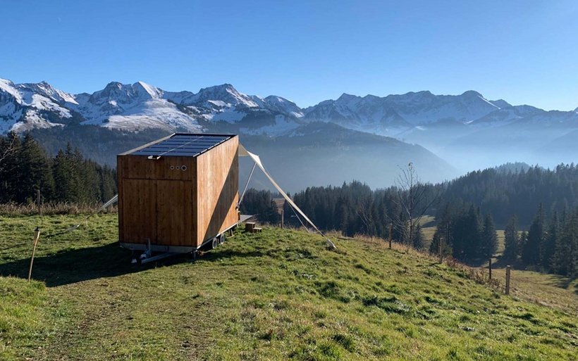 «Das ‹My Saess› ist eine mobile Unterkunft, die auf einem fahrbaren Untersatz steht.» So simpel lautet die Beschreibung dieses neuartigen touristischen Angebots. In Wirklichkeit steckt natürlich viel mehr in diesem Konzept des Berner Designers Jérôme Rütsche: Das knapp zehn Quadratmeter grosse, aus Holz gebaute «My Saess» ist so gestaltet, dass es Schlafplätze für bis zu vier Personen bietet, zudem einen kleinen Küchenbereich, eine Toilette, Strom und Wasser sowie eine Fussbodenheizung.