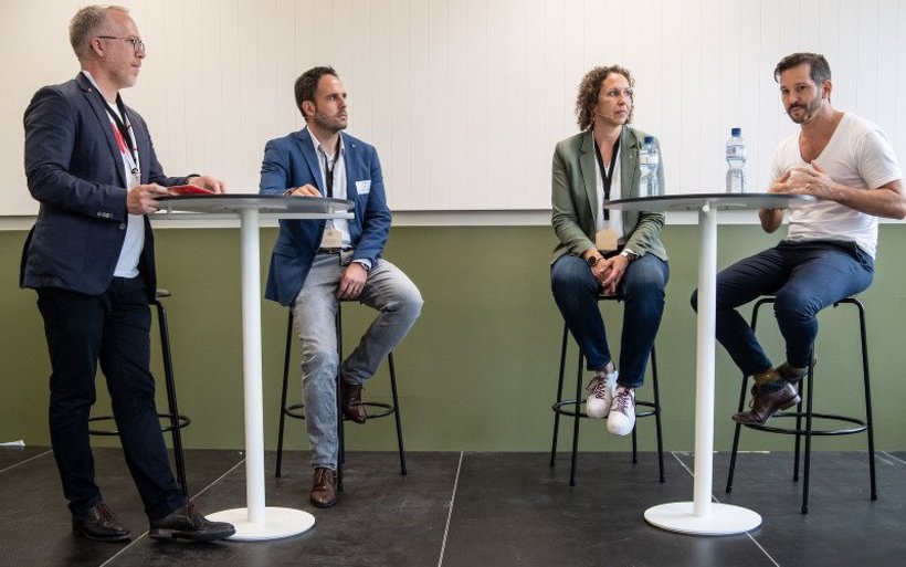 Podiumsdiskussion zu Wie Innovation gelingt (v.l.): Moderation Ueli Schneider, Chris Rosser, Aparthotel Adelboden, Janine Rüfenacht, Vizedirektorin und Projektleiterin, The Lab Hotel, Christoph Meili, Company Factory Co-Founder. Podiumsdiskussion zu Wie Innovation gelingt (v.l.): Moderation Ueli Schneider, Chris Rosser, Aparthotel Adelboden, Janine Rüfenacht, Vizedirektorin und Projektleiterin, The Lab Hotel, Christoph Meili, Company Factory Co-Founder. Bild: Corinne Glanzmann/Nadia Schärli/Philipp Schmidli