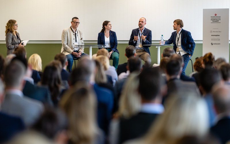 Podiumsdiskussion zu Basis: Positionierung (v.l.): Moderatorin Barbara Friedrich, Leiterin Mitglieder und ERFA Gruppen, HotellerieSuisse, Stephan JJ. Maeder, Hotelier und Verwaltungsratspräsident, Bernensis Hotel AG, Annika Grünig, Leiterin Unterkunftsmarketing & Gastronomie, Schweiz Tourismus, Fabian Messer und Marc Schlüssel. Podiumsdiskussion zu Basis: Positionierung (v.l.): Moderatorin Barbara Friedrich, Leiterin Mitglieder und ERFA Gruppen, HotellerieSuisse, Stephan JJ. Maeder, Hotelier und Verwaltungsratspräsident, Bernensis Hotel AG, Annika Grünig, Leiterin Unterkunftsmarketing & Gastronomie, Schweiz Tourismus, Fabian Messer und Marc Schlüssel. Bild: Corinne Glanzmann/Nadia Schärli/Philipp Schmidli