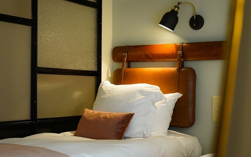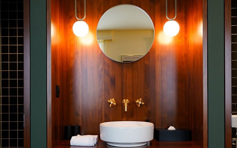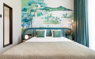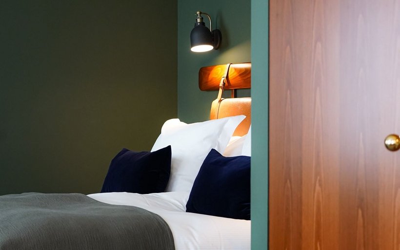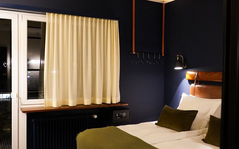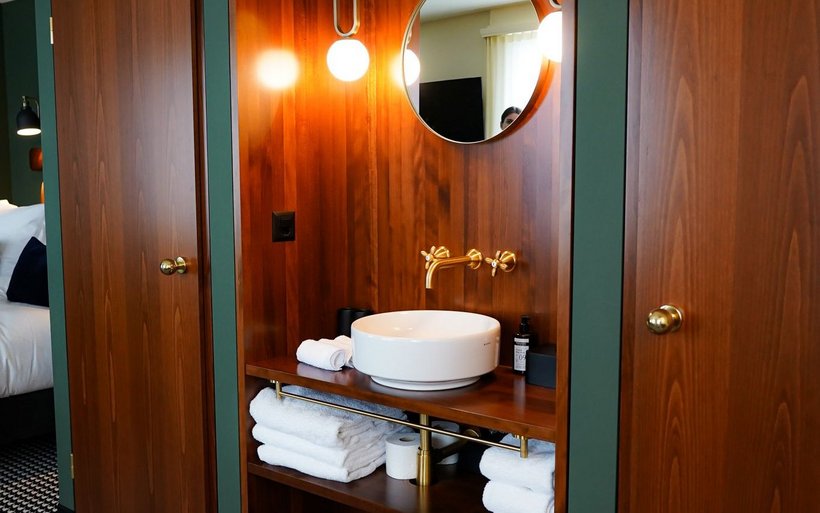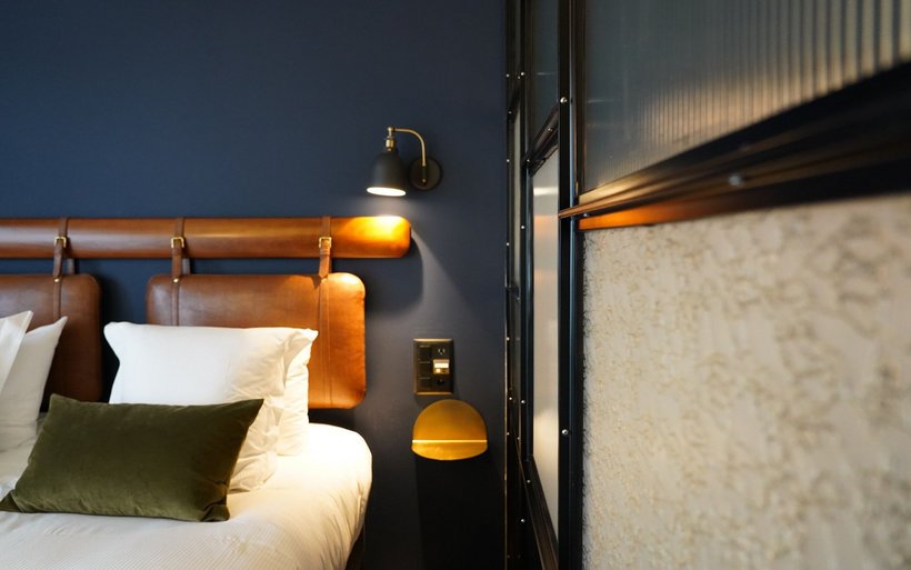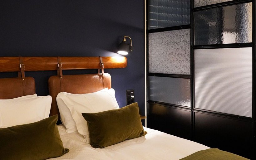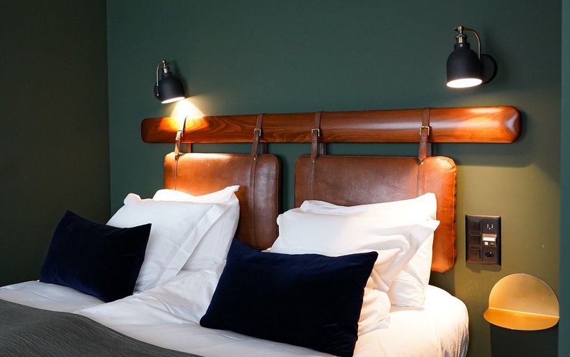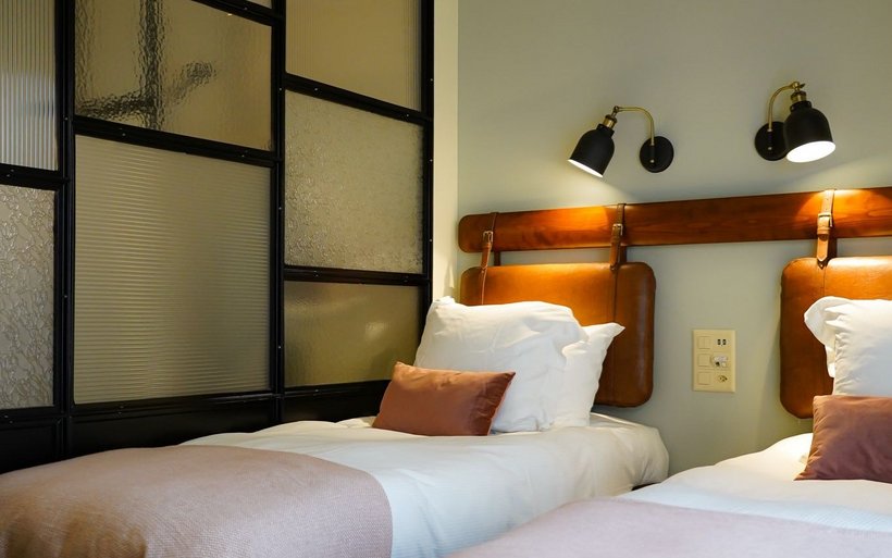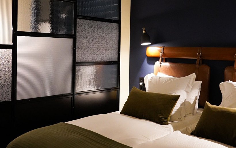 La partie du bâtiment qui abrite l’hôtel, non protégée, a également été refaite à neuf. Les 18 chambres ne répondent volontairement à aucune catégorie d’étoiles. La couleur de leurs murs varie entre l’écru, le vert sapin ou le bleu nuit en fonction des catégories: cosy, supérieur et suites. Le décor s’inspire du style Art déco et Belle Epoque avec les têtes de lit en cuir marron, le bois de cerisier, les miroirs arrondis, les lampes globes, la robinetterie en laiton et le verre à l’ancienne réalisé sur mesure pour séparer la partie chambre de la salle de bain. Chaque chambre porte le nom d’une curiosité locale et invite son résident à partir à la découverte de ce lieu touristique grâce à une notice explicative en chambre.
