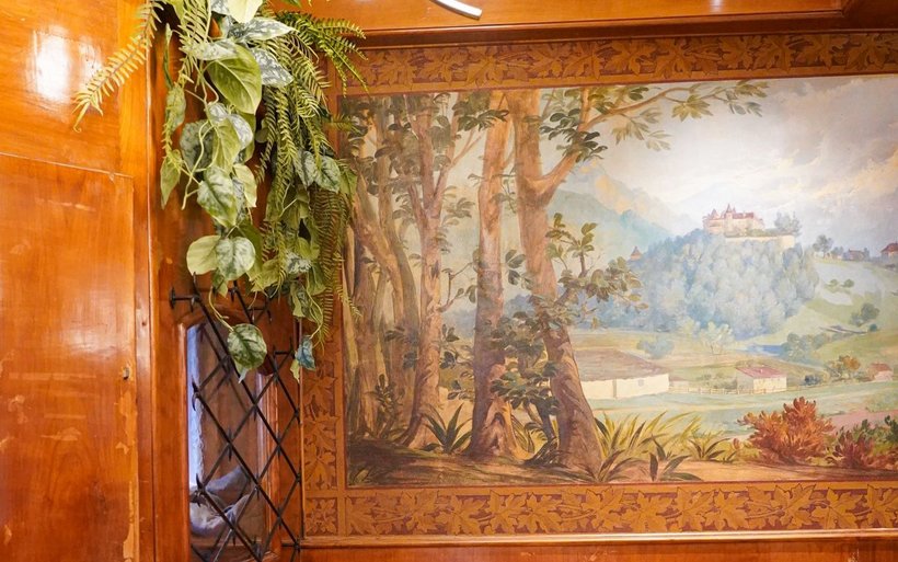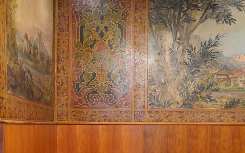Retour au rez. Ces travaux ont aussi permis de découvrir de belles surprises, comme le parquet d’origine et les boiseries d’époque. Et surtout: ces magnifiques peintures murales datant de 1901, signées d’un artiste piémontais Joseph Ferreiro. «Ces fresques avaient totalement disparu de la mémoire collective bulloise. Seule une partie de celle représentant le château de Gruyères était restée apparente, tandis que les autres avaient disparu sous d’épaisses couches de crépis et de peinture. Les restaurateurs d’art ont passé quatre à cinq mois à gratter au cutter pour les révéler», relate Georges Prost.