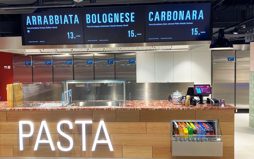 Die rund 160 Quadratmeter grosse Verkaufsfläche ist mit vier Countern ausgestattet: Spiga Pizza, Spiga Pasta, Sesh Bowls und Sesh Bar. Die Pizza ist mit einem neapolitanischen Teig zubereitet, der 72 Stunden gereift ist und während nur 90 Sekunden im Ofen  gebacken wird. Am Pasta-Counter gibt es frisch zubereitete Penne mit einer Auswahl an klassischen und beliebten Saucen: Bolognese, Arrabiata und Carbonara.