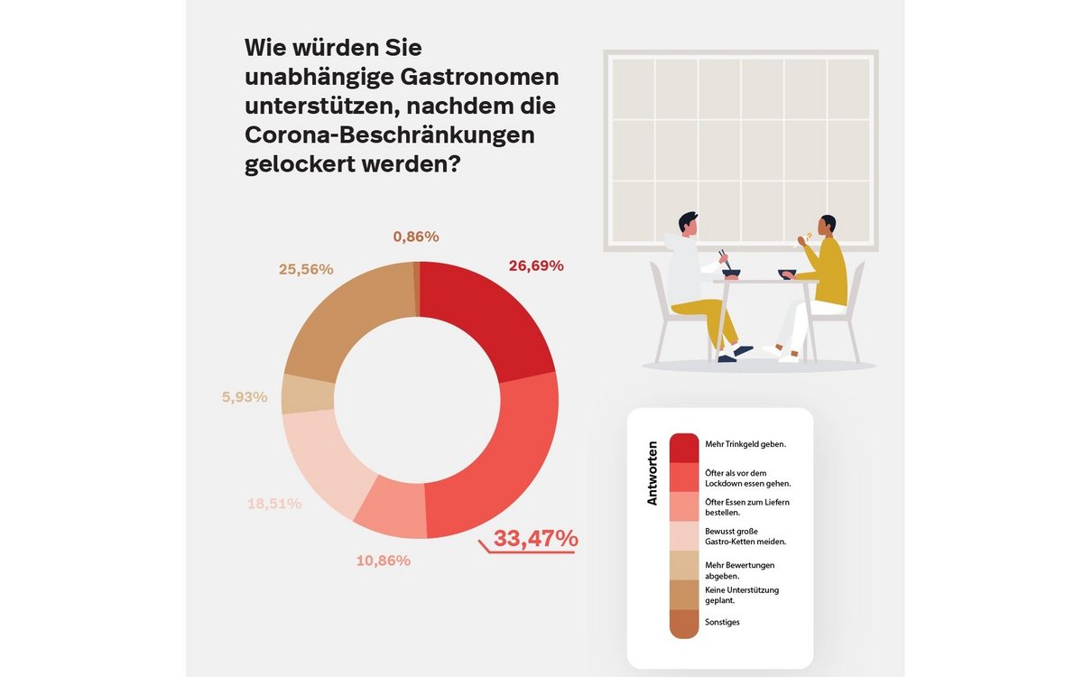Die Online-Umfrage ergab, dass Herr und Frau Schweizer mehr als bereit dazu sind, dem angeschlagenen Gastgewerbe unter die Arme zu greifen. Insgesamt erklären sich 95 Prozent der Befragten dazu bereit, die Branche zu unterstützen. Etwa jeder dritte Schweizer (33,47%) würde dafür öfter auswärts essen gehen, knapp jeder Vierte (26,69%) wäre bereit, mehr Trinkgeld zu geben; 18,51 Prozent würden grosse Restaurantketten aktiv meiden, und 10,86 Prozent würden sich mehr Mahlzeiten liefern lassen, um unabhängige Gastronomiebetriebe zu unterstützen.
