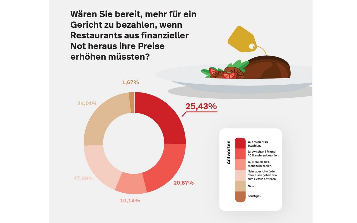Auch Preiserhöhungen, die für Restaurants immer ein sensibles Thema sind, würden von vielen Verbraucherinnen und Verbrauchern akzeptiert werden. Fast ein Viertel der Befragten (25,43 %) würde bis zu 5 Prozent mehr für ein Gericht bezahlen, wenn das betreffende Restaurant die Preise aus finanzieller Notwendigkeit erhöhen müsste. 20,87 Prozent wären bereit, bis zu 10 Prozent mehr zu bezahlen und jeder Zehnte (10,14%) würde sogar noch mehr bezahlen.