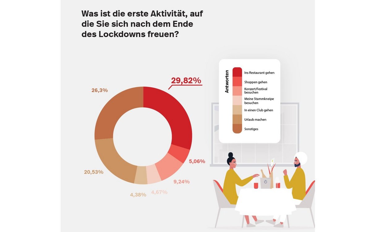 Auf die Frage, welche Art von Restaurant die Teilnehmer nach der Wiedereröffnung als erstes besuchen würden, lag das Restaurant (54,9%) weit vor Cafés (15,19%), Gourmet-Restaurants (10,58%), Bars (9,29%) und Fast-Food-Ketten (7,12%).