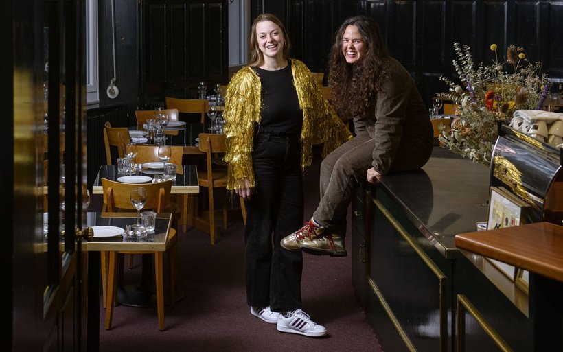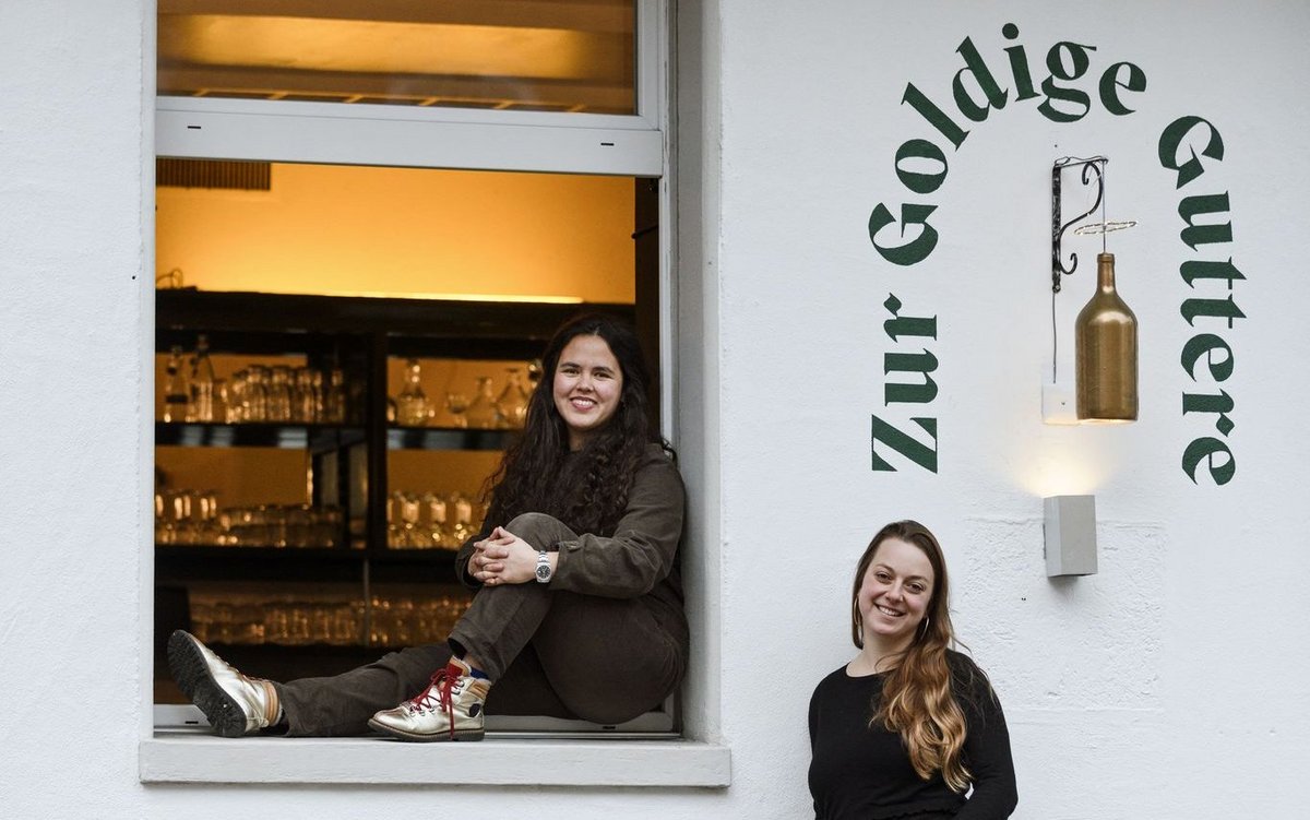 Entspannt, selbstbewusst und energiegeladen: Das sind drei Attribute, die bestens zu den beiden jungen Gastronominnen Linda Hüsser und Meret Diener passen. Seit rund vier Monaten betreiben sie das Restaurant Zur Goldige Guttere am Brupbacherplatz im Zürcher Kreis 3. Der Name ist vielversprechend und sagt einiges über die Betreiberinnen aus. Die goldene Flasche – eben besagte «Guttere» – ist eine Reminiszenz an das traditionelle Wirtshausschild. Denn Hüsser und Diener transportieren Traditionen gerne und gekonnt ins Hier und Jetzt, lockern sie mit einem schelmischen Augenzwinkern auf und setzen eine Prise Glanz obendrauf. So hängt eine zeitgemässe Interpretation des Wirtshausschildes vor dem Eingang zum Lokal. An der Bar thront eine opulente, selbst getöpferte goldene «Guttere», und das Flaschensujet taucht nochmals neckisch in Form eines goldenen Pins – mit viel Ausdauer auf Ricardo ersteigert – am Revers der Servicemitarbeitenden auf.