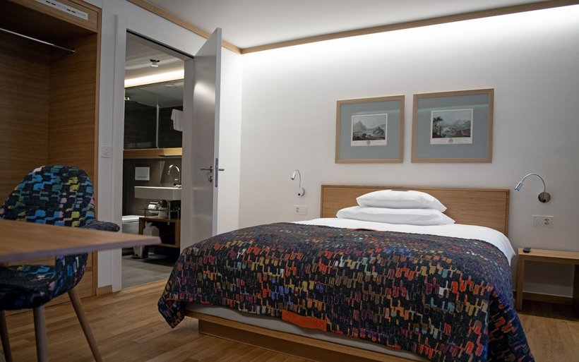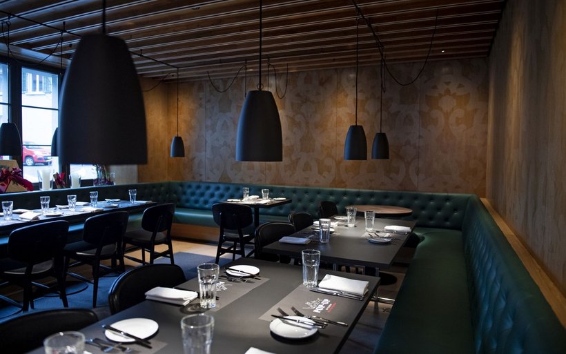 [IMG 2] Im Restaurant Ochsen – der ehemaligen Dorfbeiz – fühlt man sich beim Eintreten wie in einer gemütlichen Gaststube. Hier sorgen dunkles Grün, eine auf die Historie des Hauses Bezug nehmende Tapete und elegantes Mobiliar für eine stimmungsvolle Atmosphäre. Die ebenfalls offene Küche mit Feuer im Zentrum erzeugt viel Wohlgefühl. Das Haus Wolf nimmt Elemente der beiden Häuser auf und fügt sich optisch in das Ensemble ein. Die Zimmer und Suiten in den drei Häusern unterscheiden sich aufgrund der Architektur, verbindende Elemente sind dabei die Farben, Möbel und Textilien.