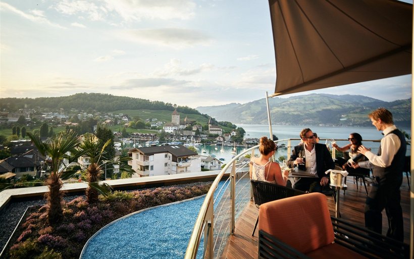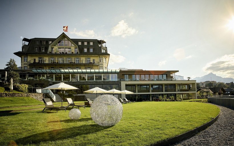 Erweitert wurde auch der Wellnessbereich. Dieser erstreckt sich neu über eine Gesamtfläche von 225 m² und bietet nun vier Saunen, Whirlpool, Kneippbecken und eine grosse Ruhezone. Der Aussenbereich besticht durch einen Infinity-Pool mit Blick über den Thunersee und lädt zum Entspannen auf der neu entstandenen Liegewiese ein. Zum Angebot des Hotels gehört nach wie vor ein privates Strandbad.