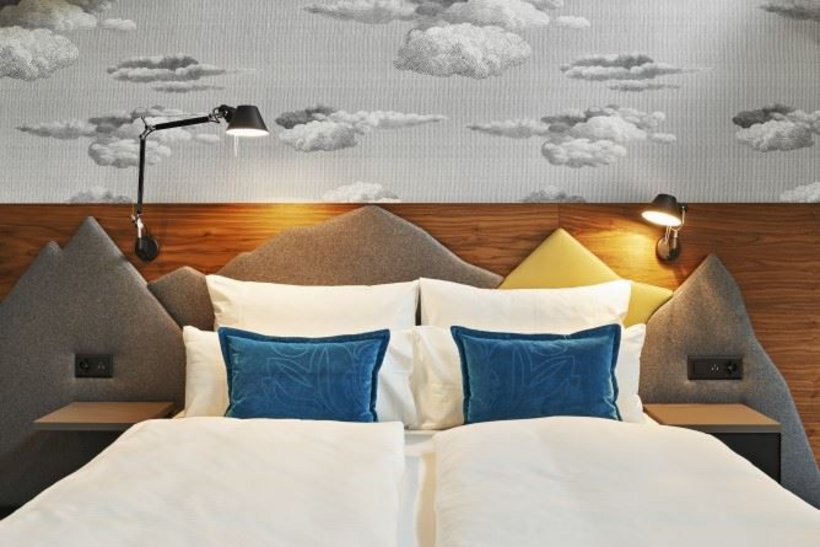 Auch bei der Gestaltung der 394 Zimmern begegnet der Gast der Interpretation des Zürichsees und den Schweizer Bergwelten wieder. Das hochwertige Boxspringbett wird eingerahmt von der Alpensilhouette und edlem Nussbaumholz. Zur Zimmerausstattung gehören unter anderem ein LG 43-Zoll-TV, ein bequemer Ledersessel der Manufaktur Freifrau und Samtvorhängen von Christian Fischbacher. Hinzu kommt ein Badezimmer aus Granit und Dornbracht-Waschtischarmatur und einer Raindance-Dusche.